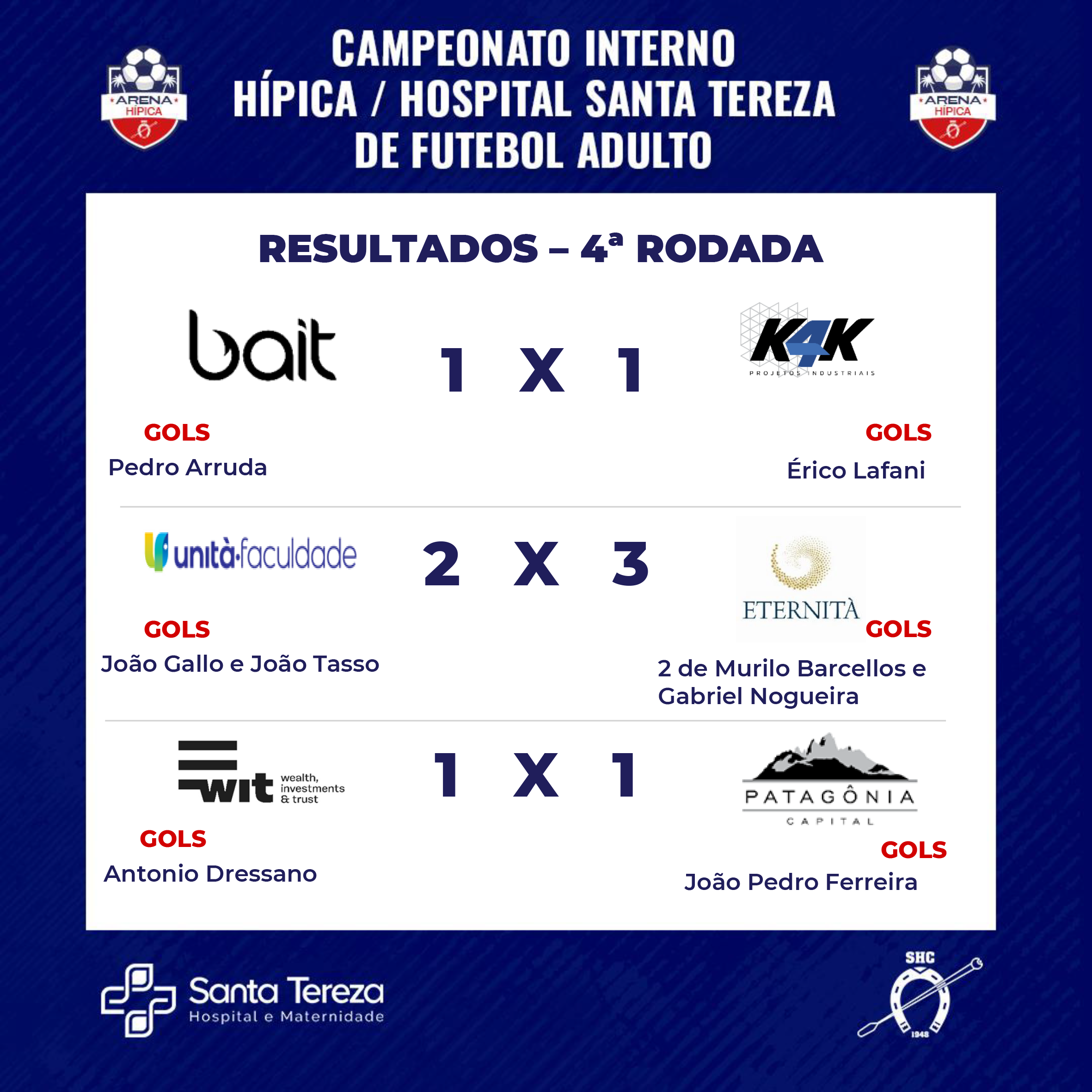 A 4ª. Rodada do Campeonato Interno Hípica/Hospital Santa Tereza de Futebol Adulto, foi de muitos gols! Os jogos, que ocorreram no sábado dia 27 de setembro, tiveram os seguintes resultados: