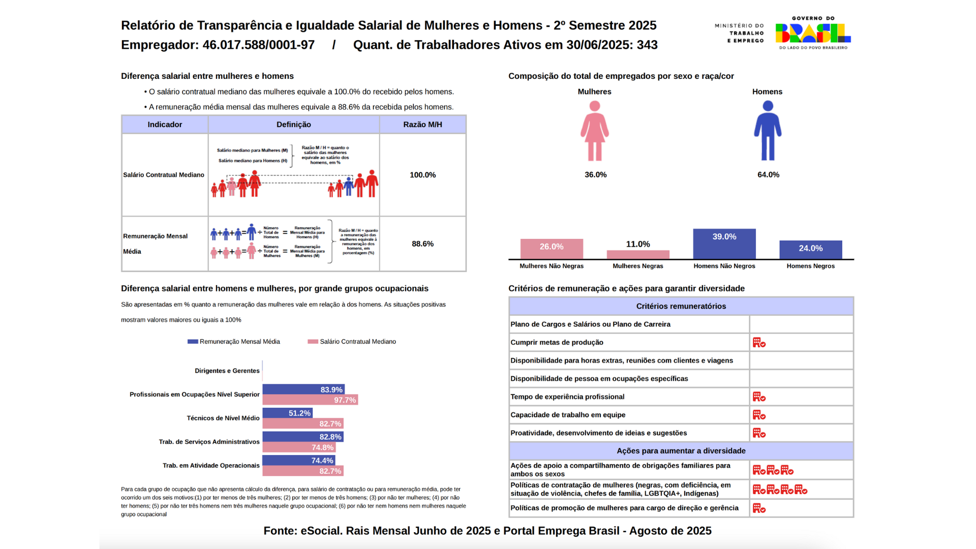 Conforme determinação do Ministério do Trabalho e Emprego (MTE), divulgamos o “Relatório de transparência salarial”, elaborado e disponibilizado pelo próprio MTE, que dispõe sobre a igualdade salarial e os critérios remuneratórios entre homens e mulheres.