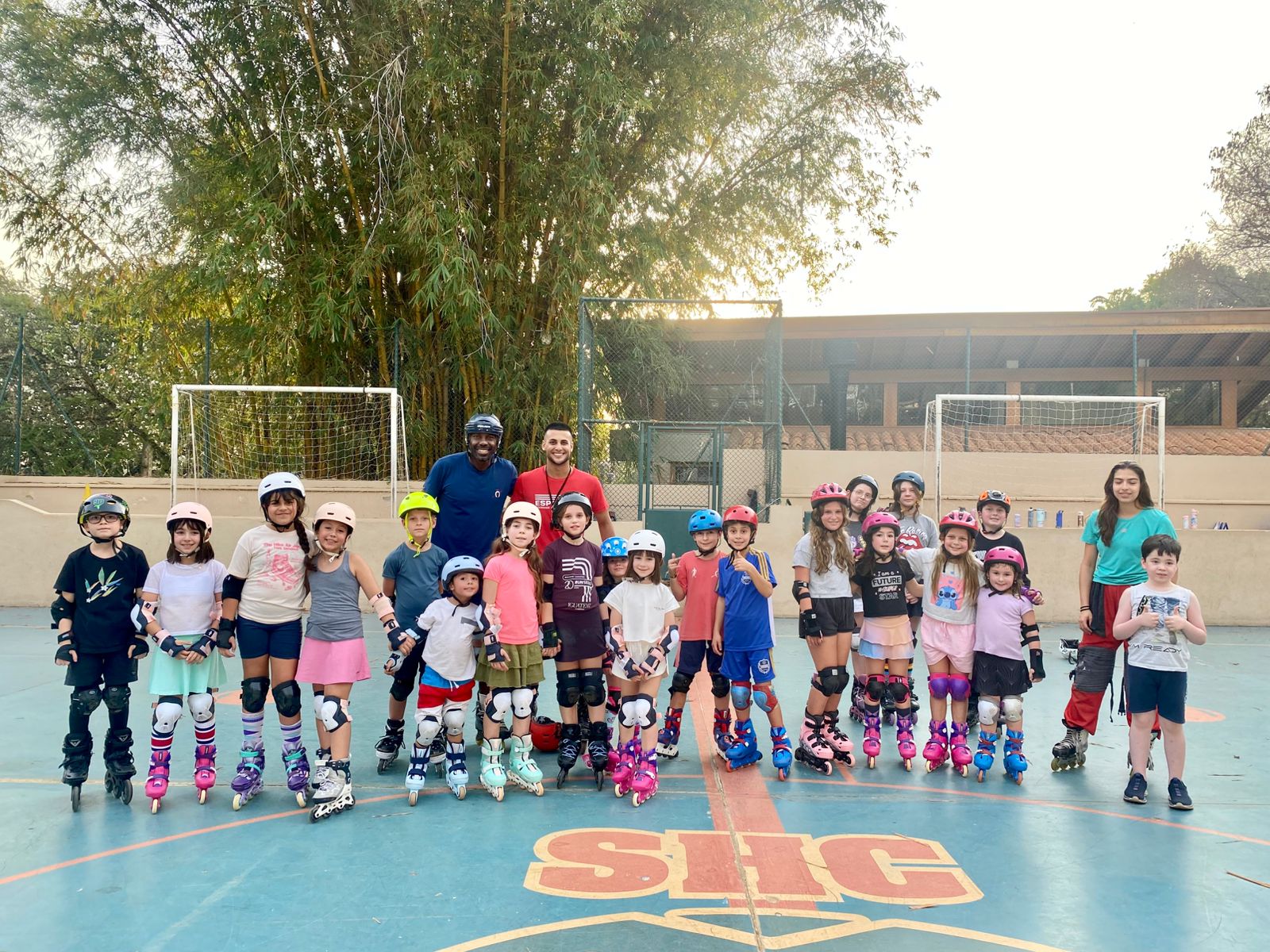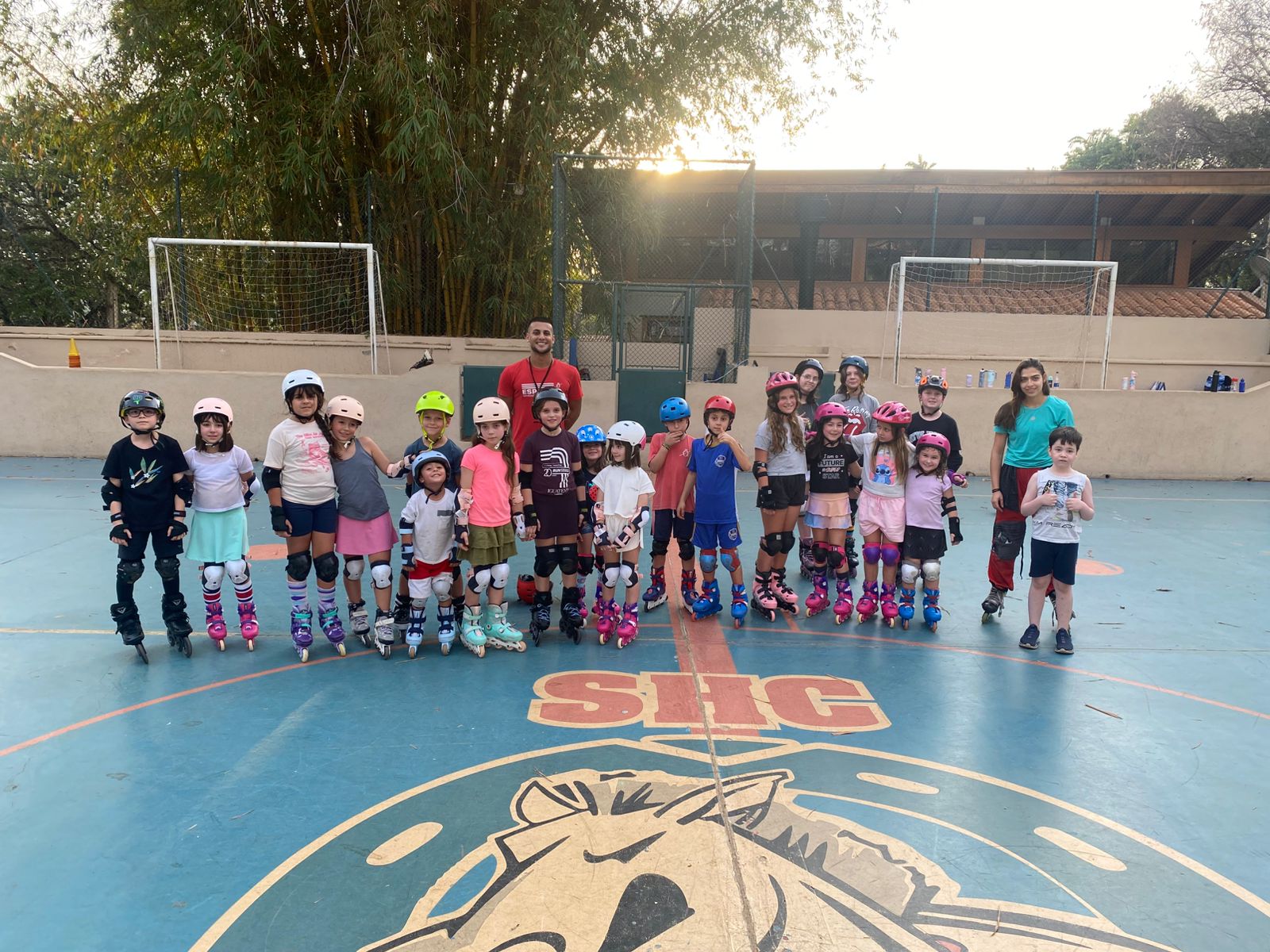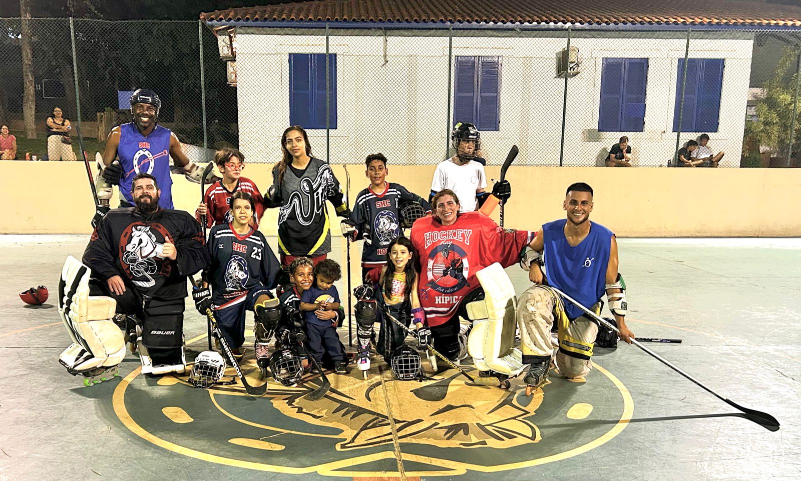 Todas as turmas e idades de cada modalidade dividem a quadra e praticam juntas, unindo crianças e adultos patinando e jogando hockey.