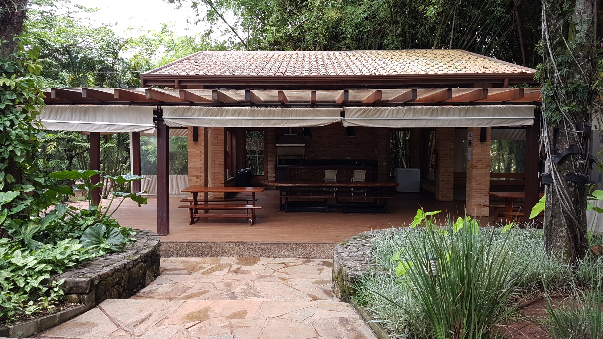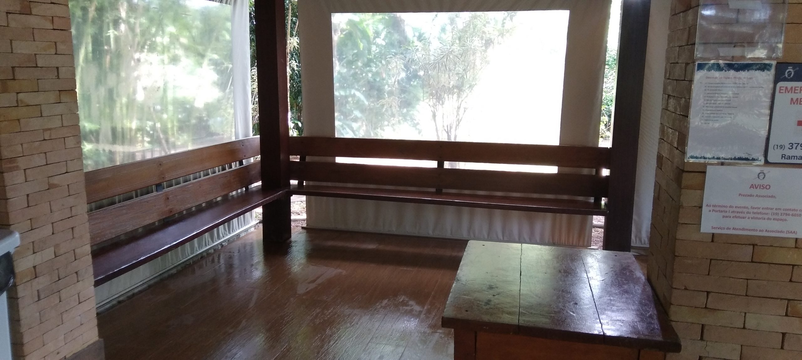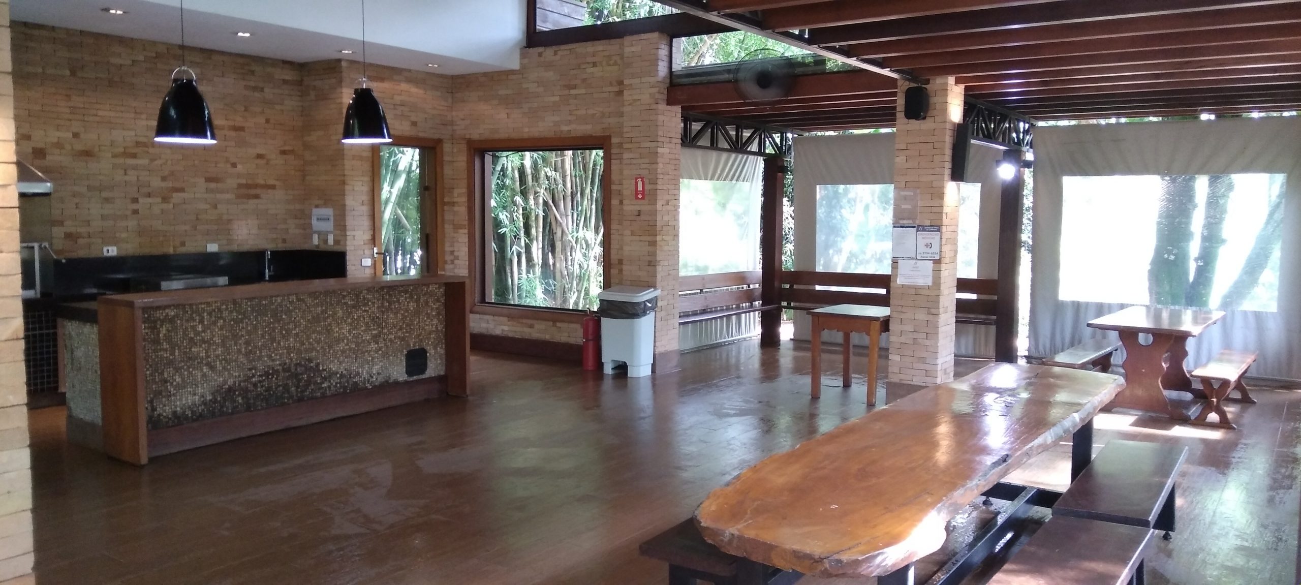 Quiosque coberto, com balcão refrigerado e freezer, mesas e bancos rústicos.