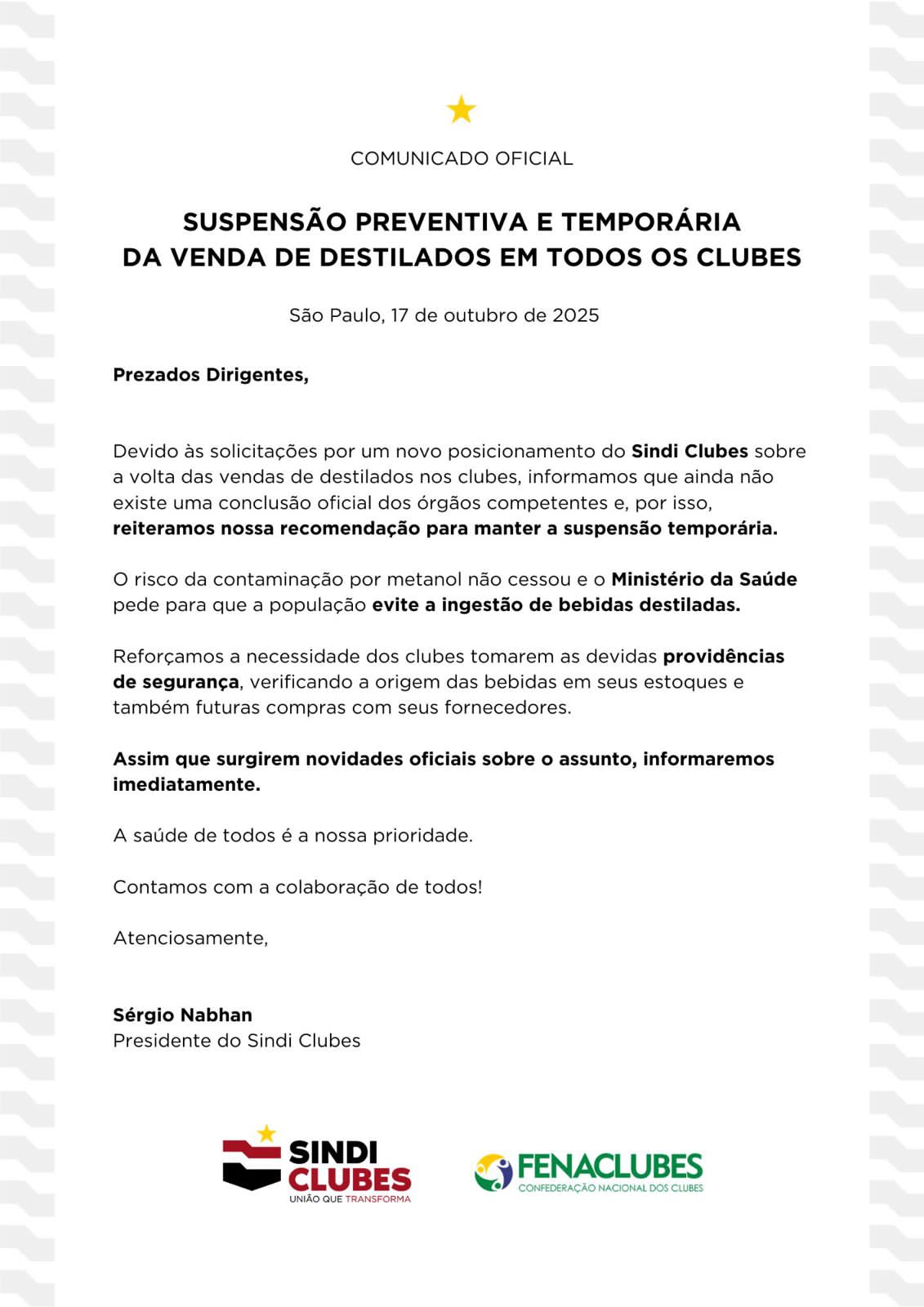 O Sindiclubes e a Fenaclubes reiteram as orientações sobre a suspensão preventiva do consumo de bebidas destiladas no clube, que a SHC adotou a partir de 01/10.