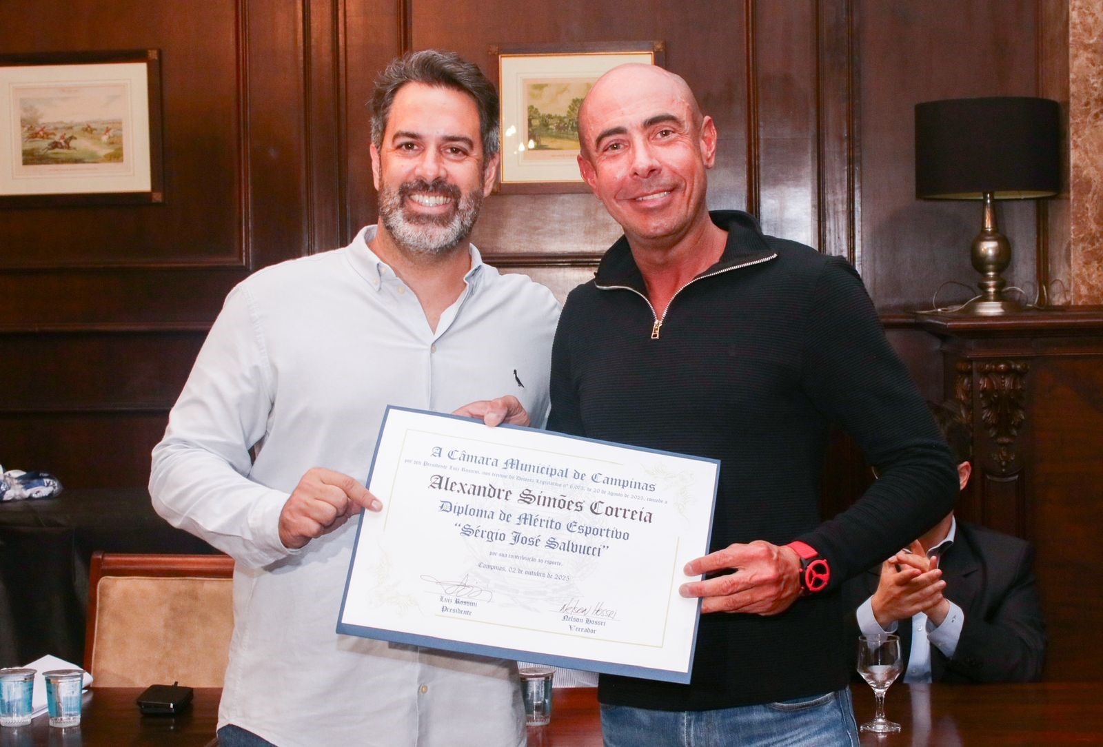 O associado Alexandre Correia, ultramaratonista que registra 10 anos de carreira esportiva, recebeu o Diploma de Mérito Esportivo “Sérgio José Salvucci” em sessão solene da Câmara Municipal de Campinas, realizada na Sociedade Hípica de Campinas, na noite de 02 de outubro. A iniciativa foi do vereador Nelson Hossri (PSD).